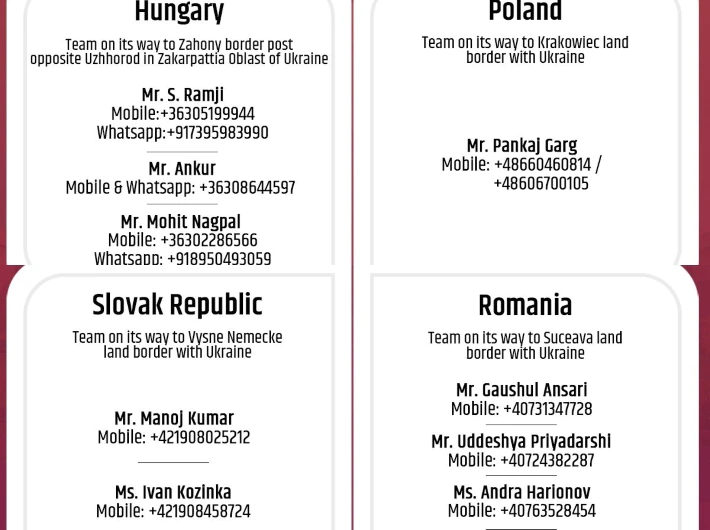 यूक्रेन पर रूस के हमले के बाद से लगातार यूक्रेन में हालात बिगड़ते जा रहे हैं। जिसके बाद भारत के लिए सबसे बड़ी चिंता उसके नागरिक यूक्रेन से सुरक्षित वापस लाना है। युद्ध के बीच भारत के लिए यह एक बड़ी चुनौती भी बनी हुई है। दरअसल, रूस के हमलों के बाद यूक्रेन ने अपनी हवाई सीमाओं को बंद कर दिया है। ऐसे में भारत हंगरी, पोलैंड, स्लोवाकिया और रोमानिया के जरिए सड़क रास्तों से भारतीयों को निकालने की योजना पर काम कर रहा है। इसके लिए विदेश मंत्रालय ने इन सीमाओं के पास अधिकारियों को तैनात किया है और इन अधिकारियों के नंबर जारी किए हैं।