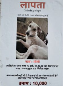 मिली जानकारी के अनुसार, प्रयागराज के सिविल लाइन नवाब युसूफ रोड की रहने वालीं सुयुक्ति सेठ ने एक स्ट्रीट डॉग पाला था. जो ढाई साल का था, जिससे वह बेहद प्यार करती हैं. सुयुक्ति के अनुसार, 25 दिसंबर को घर का दरवाजा खुला होने के कारण उनका कुत्ता मोमो कहीं चला गया. उसको बहुत ढूंढा गया लेकिन वह नहीं मिला. देसी नस्ल के कुत्ते मोमो के लिए अब सुयुक्ति ने अपने घर के आस-पास पोस्टर लगाकर उसका पता बताने वाले को 10 हजार रुपये का इनाम देने की बात कही है.