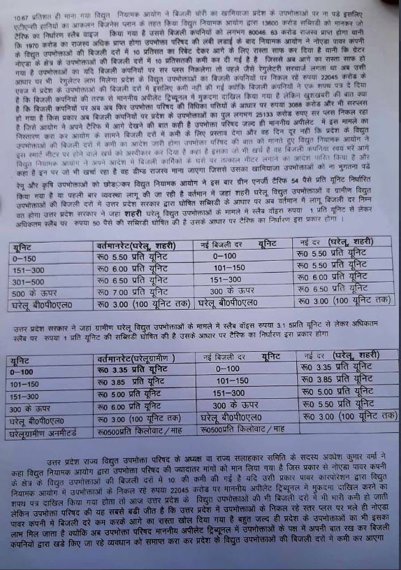 लखनऊ: यूपी में नई बिजली दरों का ऐलान हो गया है. जनता को राहत मिली है क्योंकि बिजली की दरें बढ़ी नहीं है. घरेलू बिजली की दरों में कटौती की गई है. 7 रुपये यूनिट की दर खत्म हुई. अब अधिकतम 6.50 पैसे की दर होगी. वहीं, गरीबों को बड़ी राहत मिली है. गरीबों की बिजली की दरों में भी कमी की गई है. 3.35 की बजाय अब नई दर 3 रुपये होगी. 100 यूनिट तक 3 रुपये की दर होगी. वहीं, ग्रेटर नोएडा की बिजली की दरों में 10 फीसदी की कमी की गई है. बता दें कि अभी तक माना जा रहा था कि बिजली की दरों में बढ़ोतरी होगी. फिलहाल बिजली महंगी ना होने से यूपीवासियों को बड़ी राहत मिली है.