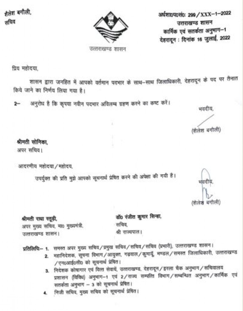उत्तराखंड में बड़ा प्रशासनिक फेरबदल करते हुए देहरादन जिले के जिलाधिकारी और एसएसपी के तबादले किए गए हैं। शासन ने बड़ा फैसला लेते हुए आर राजेश कुमार को देहरादून जिला अधिकारी के पद से मुक्त कर दिया है। जिसके बाद अपर सचिव सोनिका को देहरादून जिलाधिकारी की अतिरिक्त जिम्मेदारी सौंपी गई है। इसके साथ ही देहरादून के एसएसपी जन्मेजय खंडूरी को एसएसपी से हटाकर पुलिस उपमहानिरीक्षक और पीएसी की जिम्मेदारी दी गई। वहीं दलीप सिंह कुंवर को देहरादून एसएसपी की कमान सौंपा गई है।