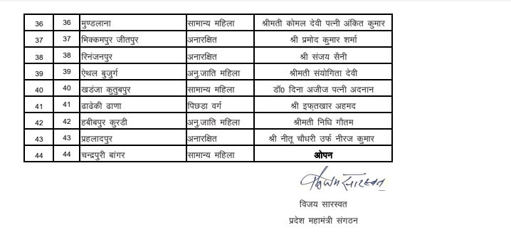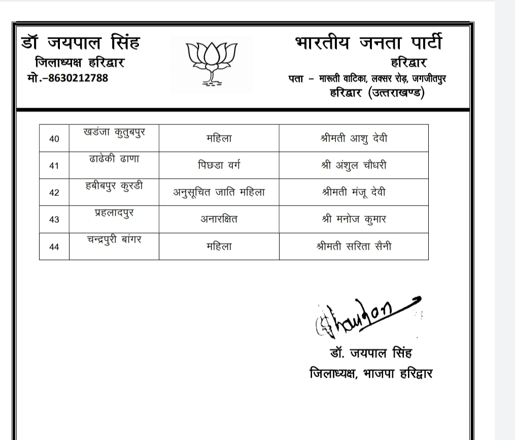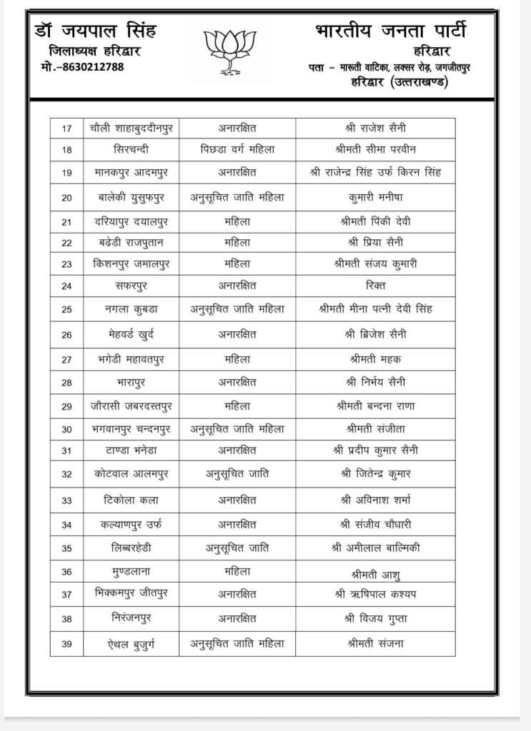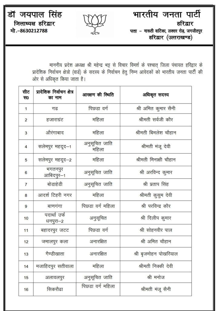 भाजापा ने पार्टी के प्रदेश प्रभारी दुष्यंत गौतम की मौजूदगी में प्रदेश भाजपा अध्यक्ष महेंद्र भट्ट और प्रदेश महामंत्री संगठन अजय कुमार ने काफी मंथन के बाद देर रात करीब 11 बजे प्रत्याशियों की सूची जारी की। भाजपा ने 44 जिला पंचायत सदस्यों में से 43 सीटों पर प्रत्याशियों के नाम घोषित कर दिए हैं।