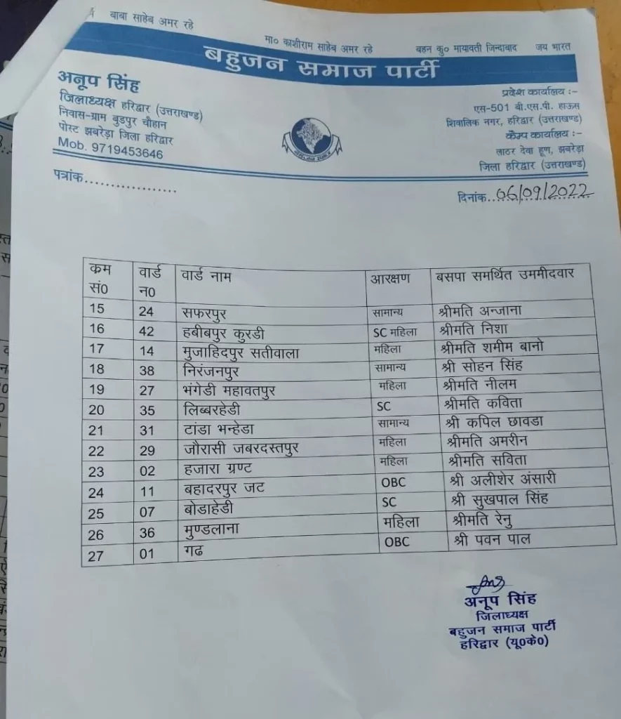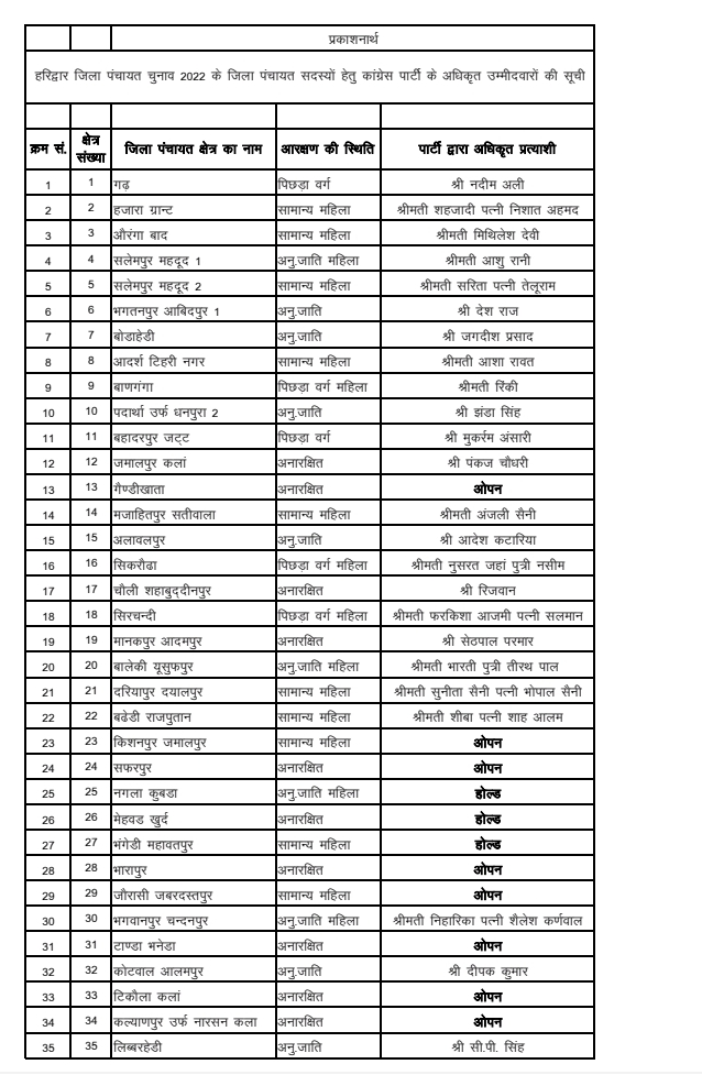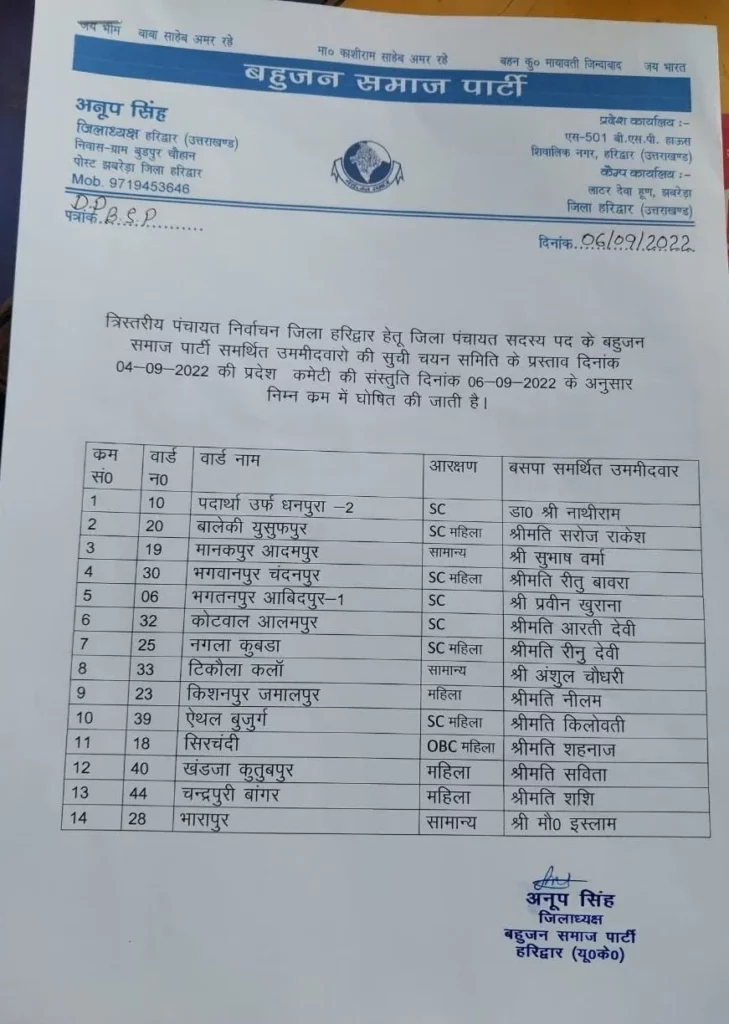 हरिद्वार पंचायत चुनाव का बिगुल बज चुका है। निकाय चुनाव को लेकर कल से नामांकन की प्रकिया भी शुरू हो चुकी है जो 8 सितंबर तक चलेगी। वहीं सभी राजनीतिक पार्टियों ने चुनाव की तैयारियों को लेकर कमर कस ली है। इसी बीच सबसे पहले बसपा ने 44 सीटों में से 27 सीटों पर उम्मीदवारों की घोषणा की थी। जिसके बाद भाजपा और कांग्रेस ने भी जिला पंचायत सदस्य पदों के लिए अपने प्रत्याशियों की लिस्ट जारी कर दी है।