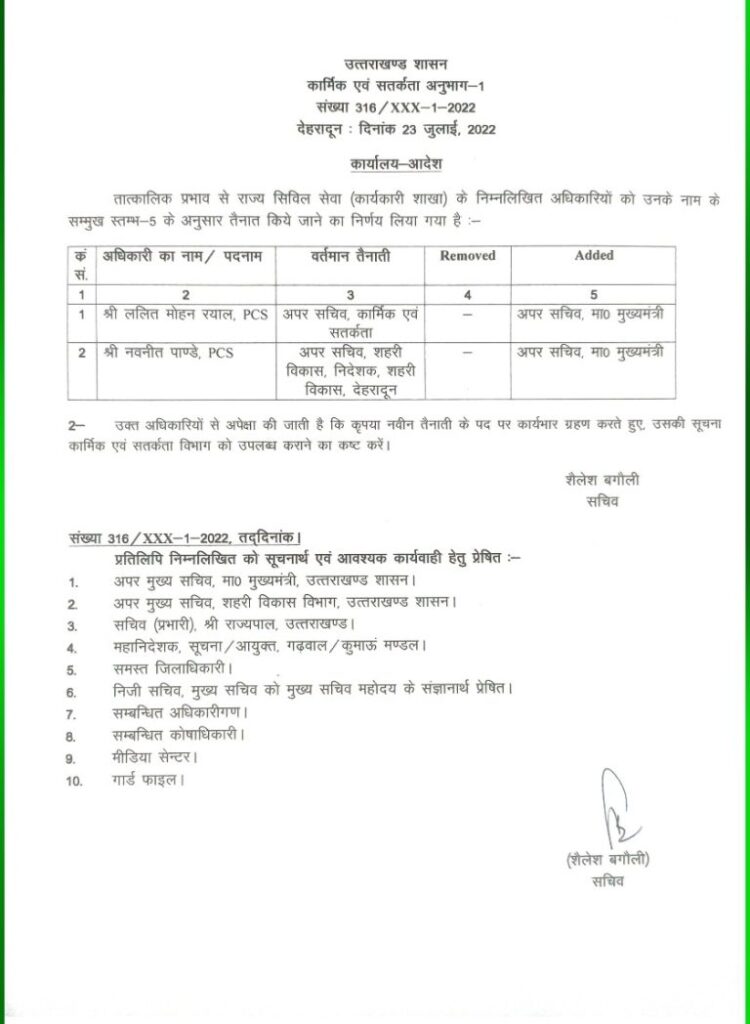 देहरादून: उत्तराखंड शासन ने दो पीसीएस अधिकारियों को नई जिम्मेदारियां दी हैं. इन दोनों ही अधिकारियों को मुख्यमंत्री का अपर सचिव बनाया गया है. हाल ही में शासन स्तर पर आईएएस और पीसीएस समेत सचिवालय सेवा के अधिकारियों के भी तबादले किए गए थे. उत्तराखंड में अधिकारियों के तबादलों का सिलसिला जारी है. शासन ने आज आदेश जारी करते हुए ललित मोहन रयाल को अपर सचिव मुख्यमंत्री की जिम्मेदारी दी है. इसके अलावा नवनीत पांडे को भी अपर सचिव मुख्यमंत्री बनाया गया है. बता दें कि यह दोनों ही पीसीएस अधिकारी फिलहाल दूसरी जिम्मेदारियों पर भी तैनात हैं. ललित मोहन रयाल के पास अपर सचिव कार्मिक एवं सतर्कता की जिम्मेदारी है. नवनीत पांडे फिलहाल अपर सचिव शहरी विकास और निदेशक शहरी विकास की जिम्मेदारी भी देख रहे हैं.